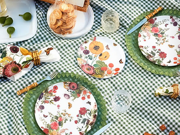 Reminiscent of fields bursting with wildflowers, the plate set from Juliska is a must-have set to refresh your nature decor collection. The plates are made from melamine and each displays a unique floral scene.