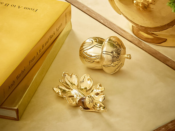 Add a whimsical flair to the tabletop with this beautifully crafted Oak Leaf Objet by Aerin. The objet effortlessly brings natural home decor elements to your place with its nature-inspired shapes and tones. According to many beliefs, acorns and oak trees signify longevity, faith, strength, and modesty. When you become aware of what the oak leaf represents along with its singular beauty, it is easy to add it to your earthly space. The objet is meticulously made from textured brass and is paired with a tiger’s eye stone acorn.