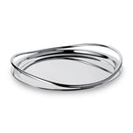 Use the large silver plated rectangular tray with two side handles to serve food, set up beverage service or for presentation of treasured objects. Vertigo’s bold motif — a subtly asymmetrical, thick ring often placed playfully askew — can be found on every piece in the collection designed by Andrée Putman.