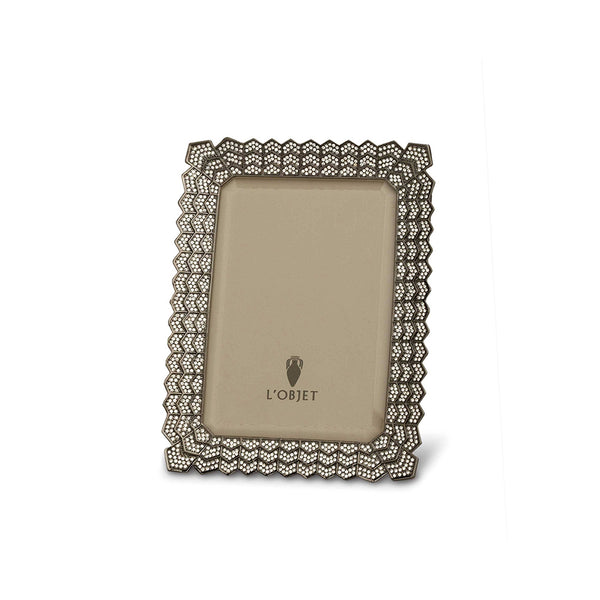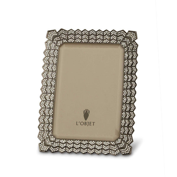Display your favorite photo in this Deco Noir Frame by L'Objet. Featuring an elegant cut design, the frame is platinum plated & adorned with Swarovski crystals.