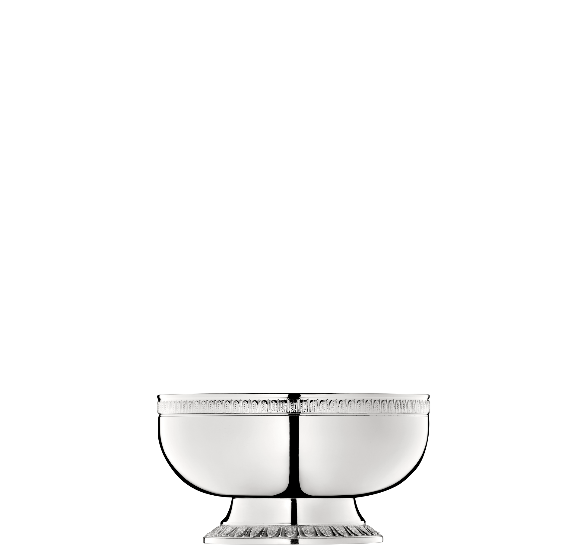Set an elegant table with the silver plated bowl with pedestal base in the Malmaison pattern. One of Christofle's most historic patterns, Malmaison typifies the Empire style, with its frieze of delicate palm and lotus leaves and symmetrical design. The name is a nod to the Chateau de la Malmaison, a favored Parisian residence of Napoleon Bonaparte and Empress Josephine.