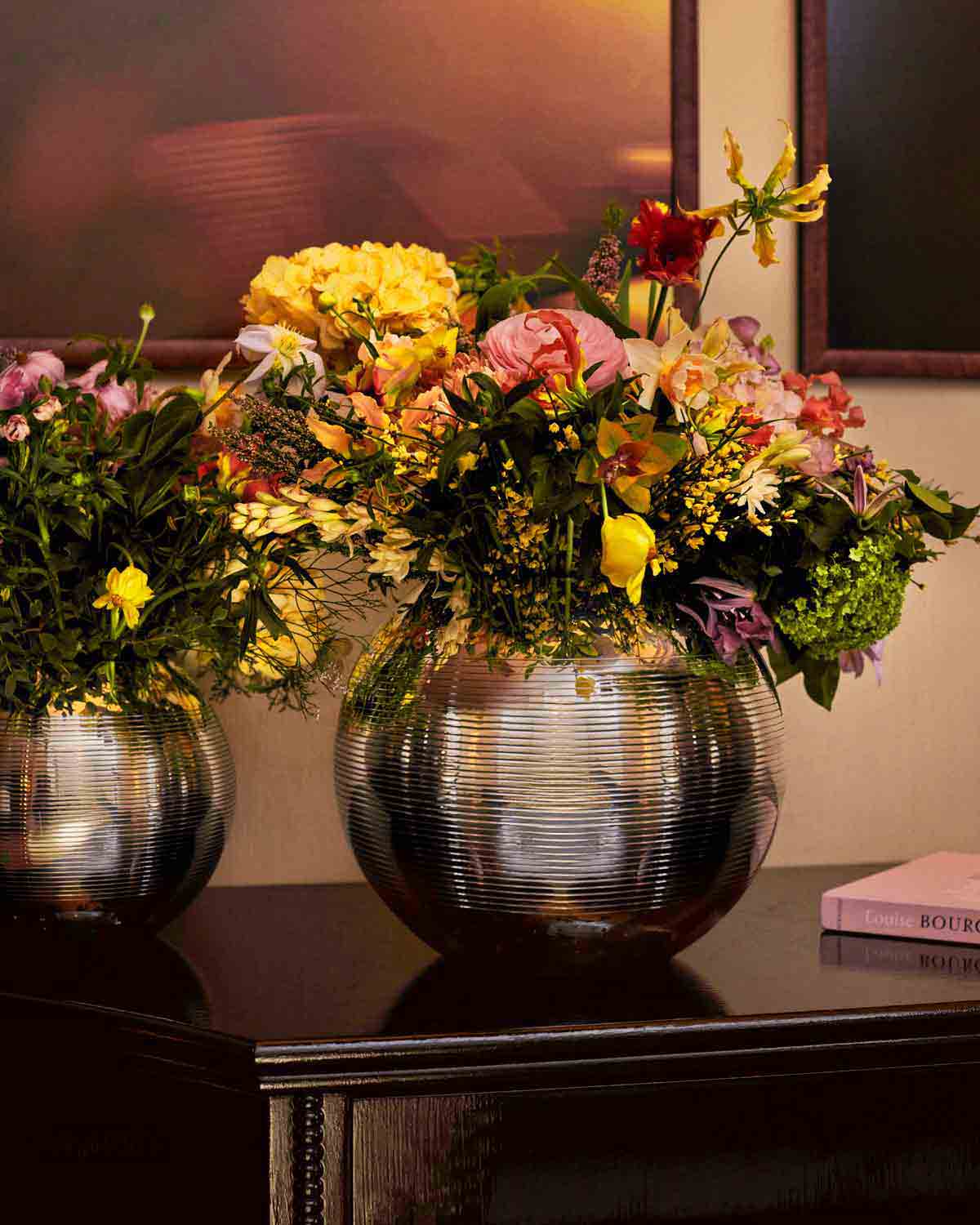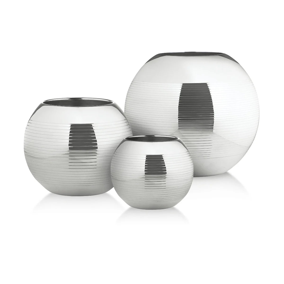 This collection is inspired by the balls used in France’s beloved pastime, the Provence-originated game of petanque. Finely engraved rings accent these rose vases’ elegant spherical forms.