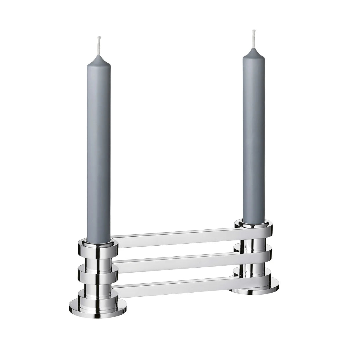 Stacked rings in brilliant silver plates give this unique double candlestick both classic geometry and contemporary style. Candlestick for 2 Candles.